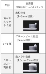 年齢ごとにフッ素入り歯磨き粉の量の目安があります。