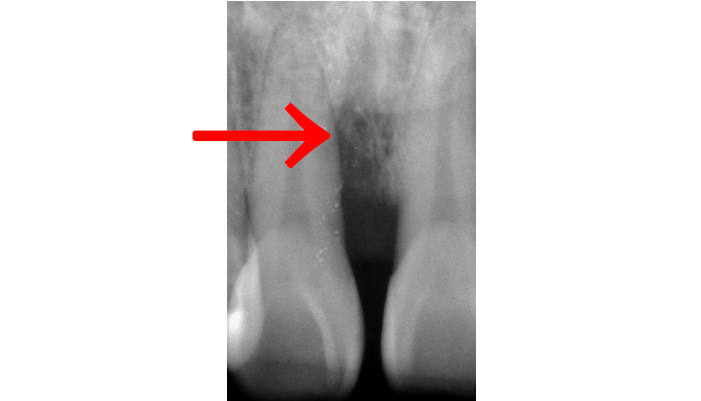 | 治療内容 | レントゲンで確認すると、根尖病変が認められ根管治療を行いました。 |
