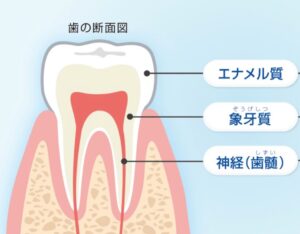 歯というはエナメル質→象牙質→神経(歯髄)の順に構造をしています。